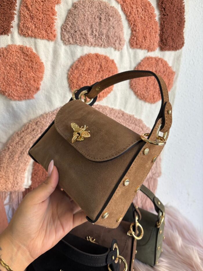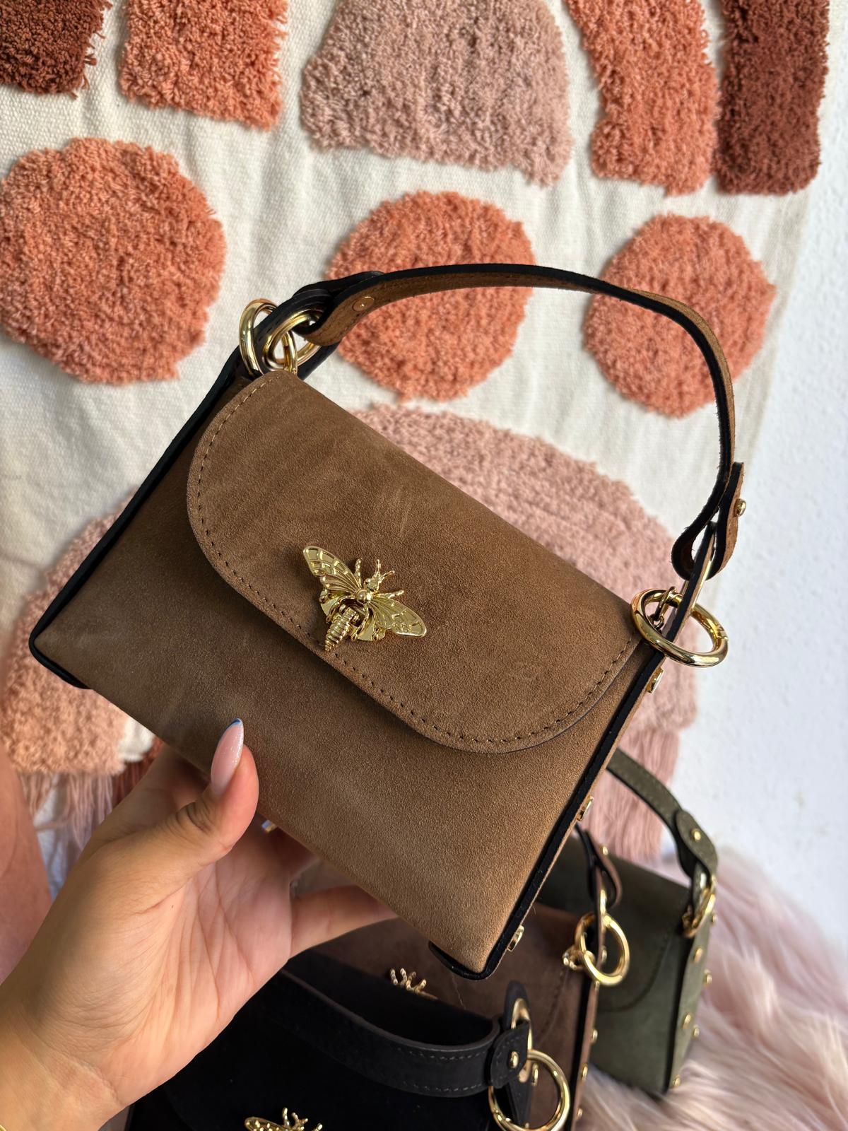 ♥ Bolso en tela de ante en color camel, con detalles y hebillas doradas.